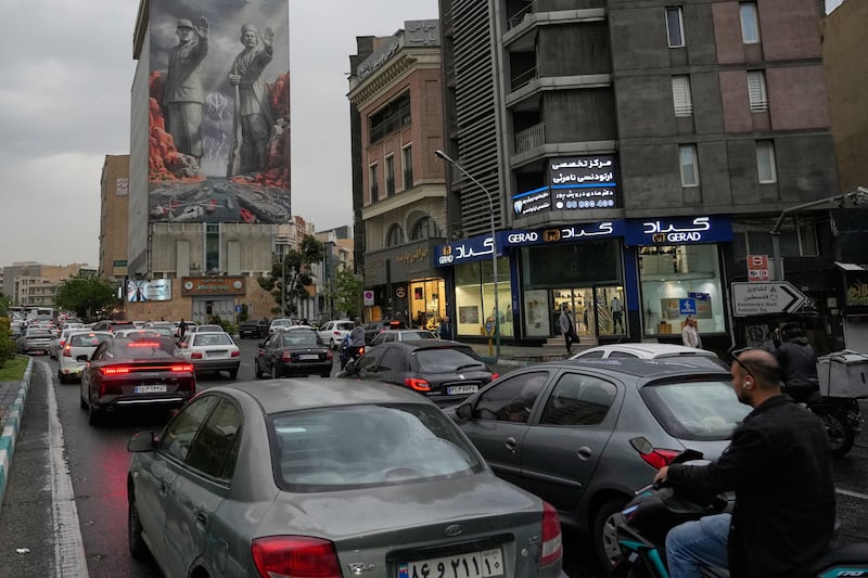 Iran War Vehicles drive past a billboard showing Rais Ali Delvari, a national hero in an early 1900 uprising against British forces in southern Iran in the Persian Gulf, right, and the late Revolutionary Guard's navy chief Alireza Tangsiri, who was killed in the U.S.-Israeli strike in late March 2026, commanding the closure of the Strait of Hormuz, on a building at a square in downtown Tehran, Iran, Monday, April 20, 2026. (AP Photo/Vahid Salemi)