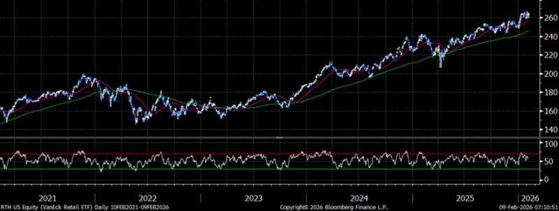 The post COVID-19 business cycle is unique. Never has there been so much monetary and fiscal stimulus thrown at the economy. The 2022 Fed tightening cycle did not break the economy and there is enough stimulus in the One Big Beautiful Bill (OBBB) to boost the consumer, the economy, and earnings in 2026. We get very concerned after the mid-term election in November that a fiscal cliff is ahead. Put these retail ETFs (RTH, RSPD) on your radar. Not to buy it, but to use it as a forward looking guide to the consumer. We keep seeing higher highs for now.