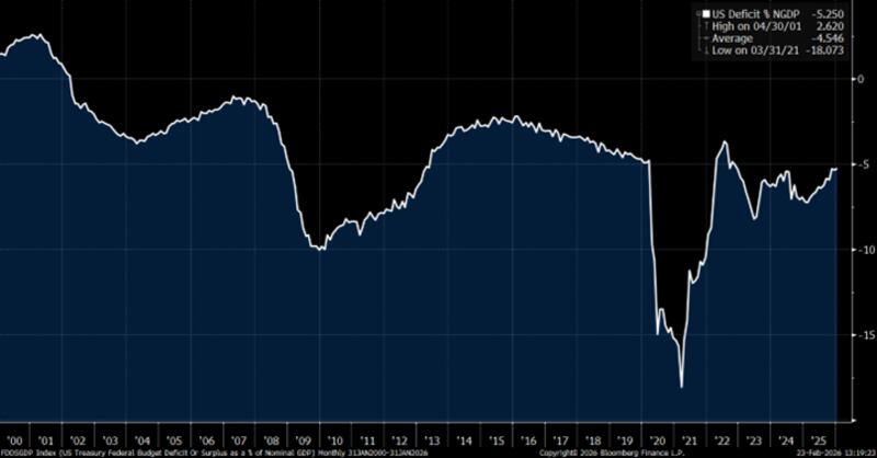 President Trump claims the US economy in 2025 was the “best ever.” No doubt, he will wave that banner during the SOTU on Tuesday night. Last year, the US economy added less than 20,000 jobs per month and is currently estimated to grow at a little over two per cent while running a deficit (as a percentage of nominal GDP) of 5.25 per cent. I would comment this is closer to the worst ever! The current CBO estimate is for this deficit to continue as far as the eye can see. Just about every government in the world has deficit issues. We have seen over the years that deficit growth helps the economy grow and it will matter for markets only if inflation cannot be controlled, as we saw with the inflation spike post COVID and the rapid rate rises that we saw in 2022 to kill it.